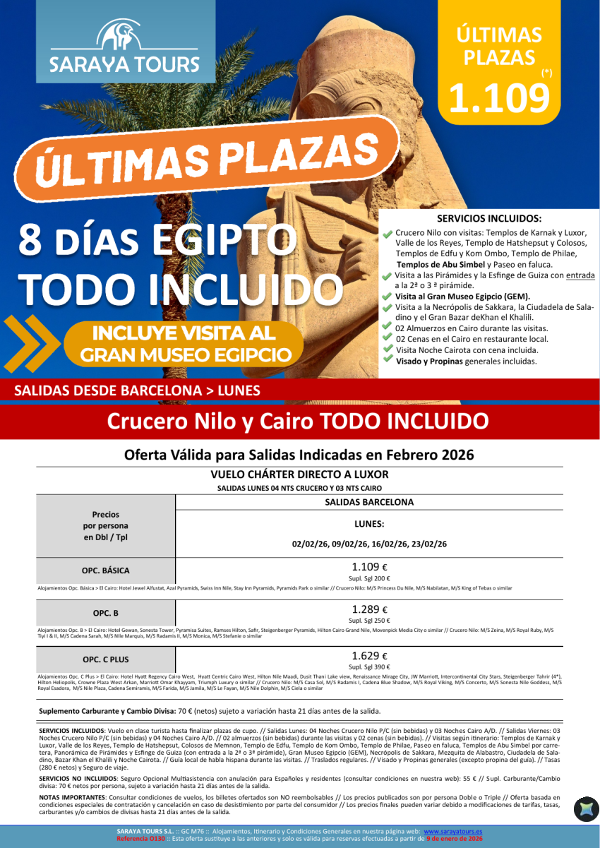 Últimas Plazas Egipto Todo Incluido. Vuelos desde BCN. Crucero NIlo y Cairo + visitas, visado y propinas